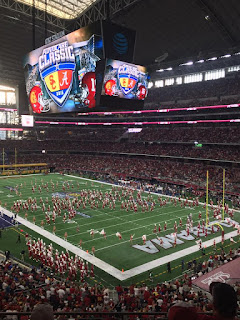 The next day, before we headed back to Monroe, LA (it is really right in the middle of the drive from Alabama to Texas) to spend the night, we stopped by AT&T Stadium to do a tour. We didn't get to do the full tour like Kip & I did the first time we went, but we did get to go on the field. It was still painted from the game the night before.